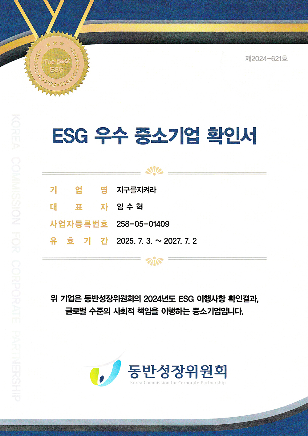 2025년 롯데면세점 협력사 ESG 지원사업을 통해 동반성장위원회와 (주)전략과혁신의 컨설팅을 받아 ESG 우수중소기업 확인.